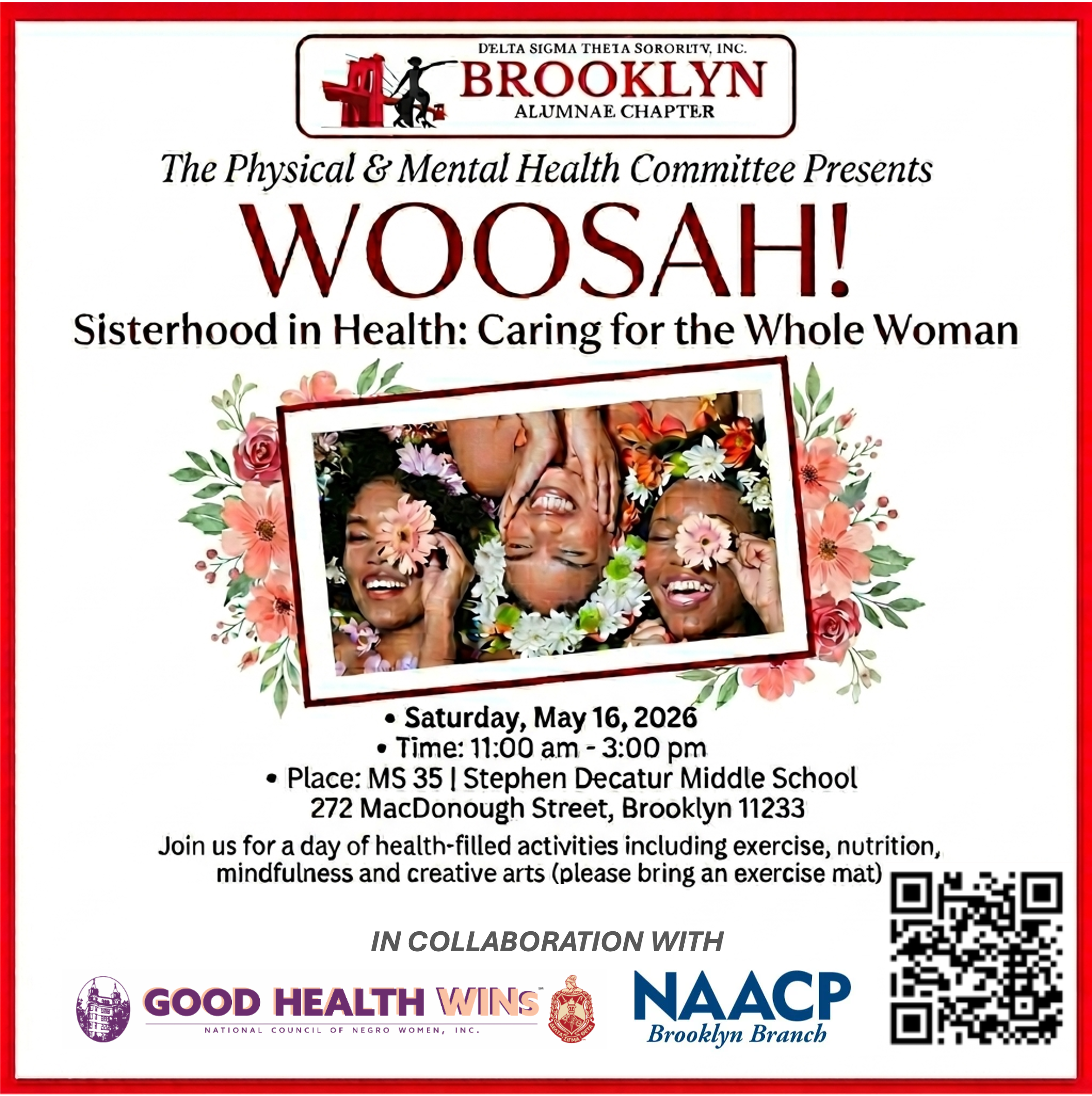 Please join the Brooklyn Alumnae Chapter of Delta Sigma Theta Sorority, Inc. and NAACP Brooklyn Branch on Saturday, May 16, 2026 as we “WOOSAH – Women Optimizing Our Selfcare And Health!”
